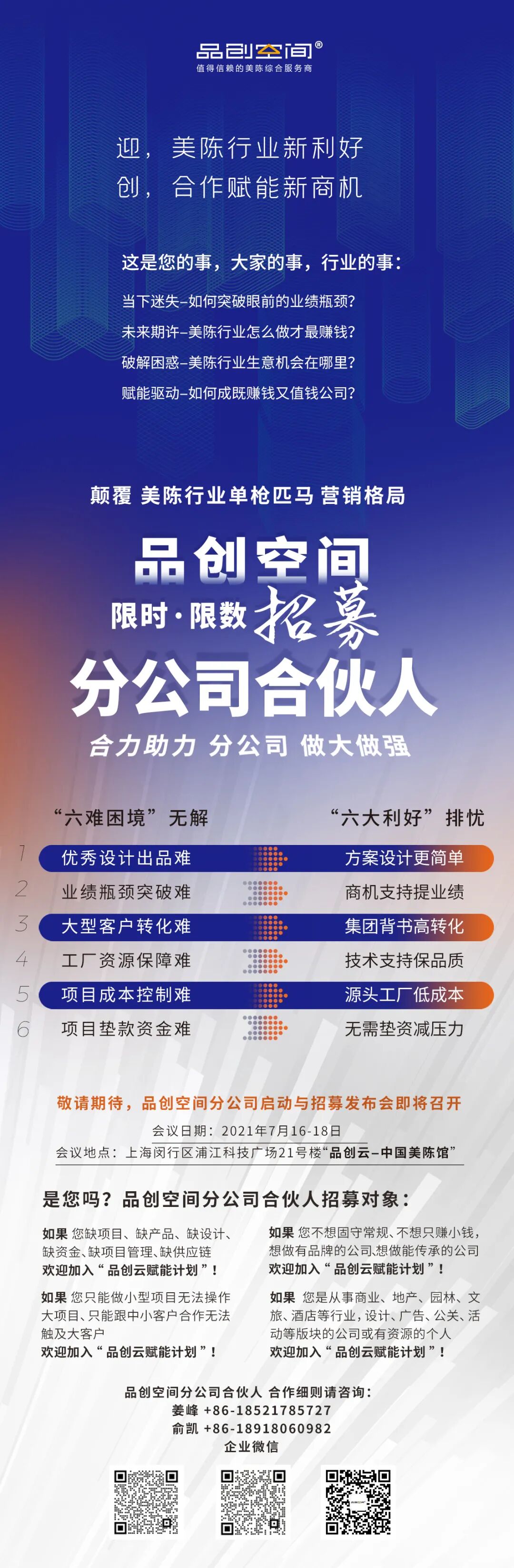 现在,“品创云”正在限时开启分公司合伙人招募,如果你目前的痛点可以通过“品创云”解决,如果你想深入了解“品创云设计平台”功能,如果你想一起探索美陈的无限可能,欢迎加入“品创云”赋能计划!