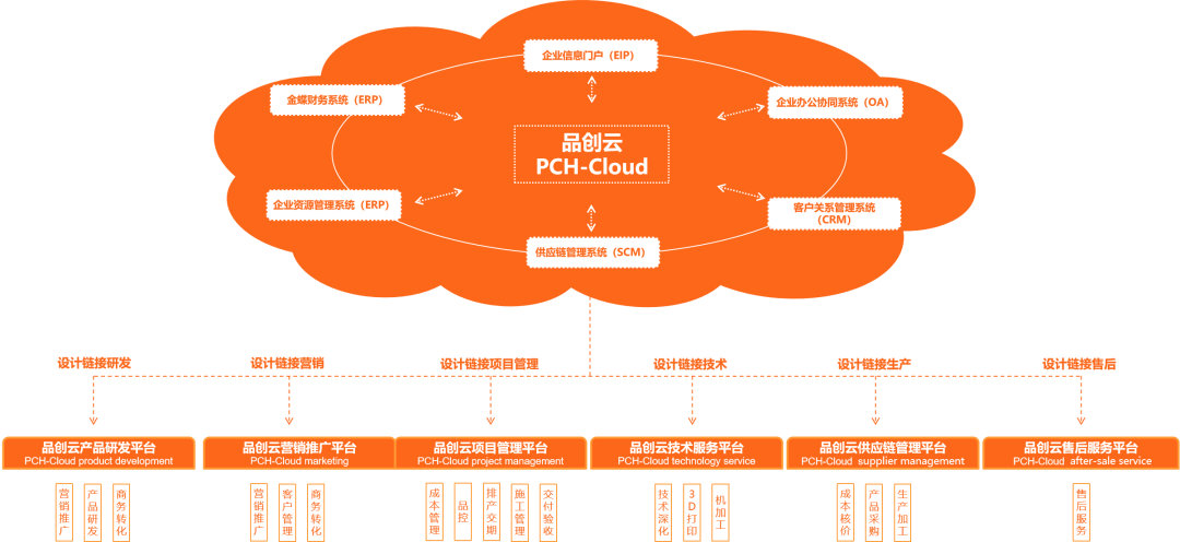 在云端,“品创云”打通企业信息门户(EIP)、企业办公协同系统(OA)、客户关系管理系统(CRM)、供应链管理系统(SCM)、企业资源管理系统(ERP)和金蝶财务系统,实现云端大数据的全面交互,还在终端打通研发、推广、项目管理、技术深化、供应链生产、售后服务等各个环节。